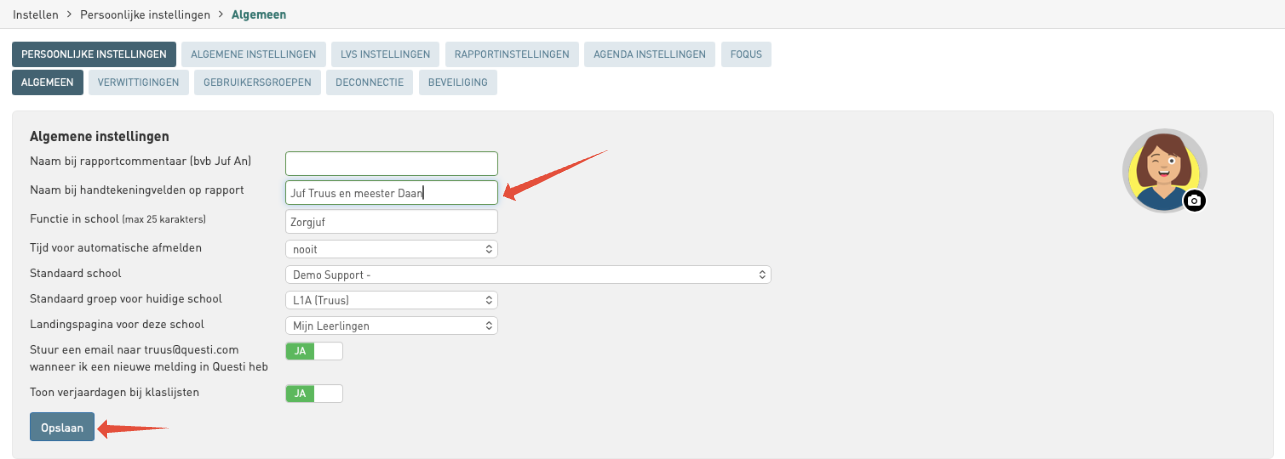 Naast 'Naam bij handtekeningvelden op rapport' geeft die beide namen in, bijvoorbeeld: "meester Jef en juf Lien".