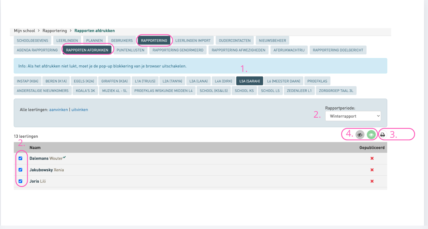 Via deze pagina kan je rapporten in bulk afdrukken of ze in één keer tonen aan de ouders.