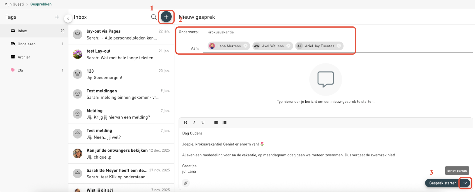 Klik rechtsonder op het pijltje naast ‘Gesprek starten’ (bij een nieuw gesprek) of naast het vliegericoontje (bij een bestaand gesprek). Dit is de optie ‘Bericht plannen’.