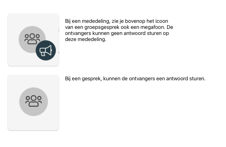 ! Een bericht dat zichtbaar is voor de hele groep, is ook in de individuele gesprekken nog herkenbaar aan het groepsicoontje rechtsboven het bericht (zie screenshot hierboven bij 'Je mag laten weten of je kan rijden...').
