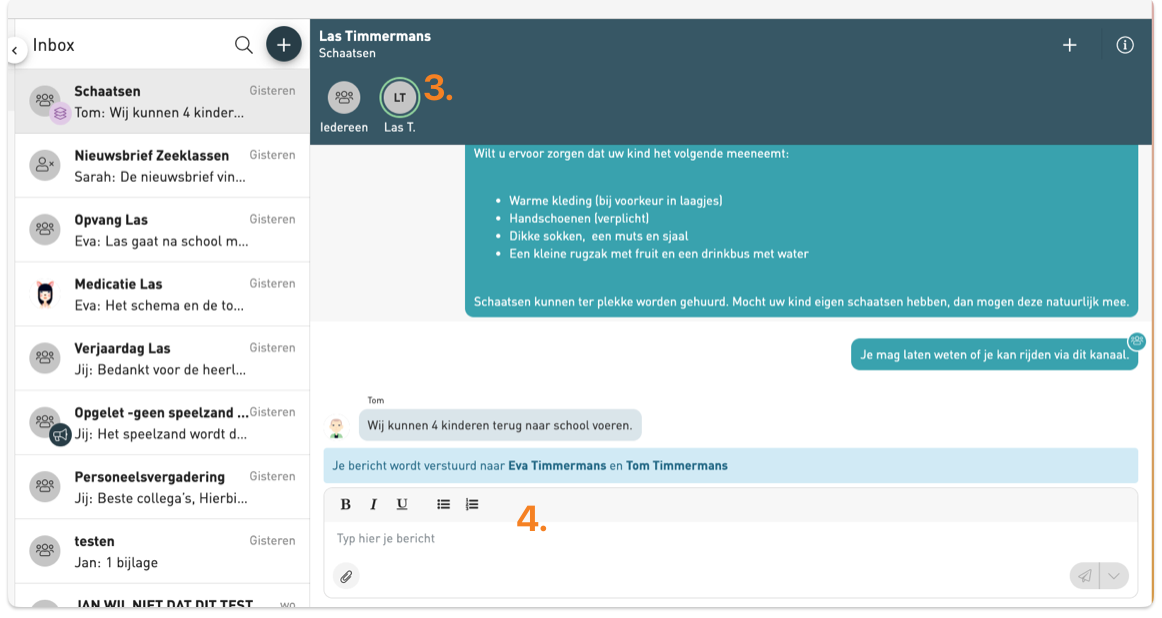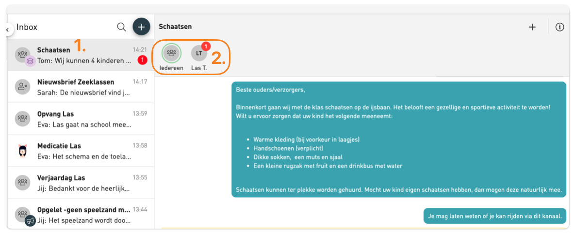 2. Bovenaan zie je een bol voor 'iedereen', dat is het groepsgesprek, met erlangs nu ook een bol voor Las T. Die bol komt er omdat een ouder van Las geantwoord heeft in het gesprek van de leerkracht.