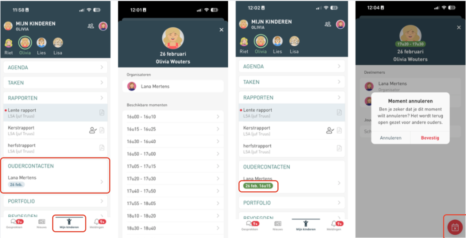 Klik op het oudercontact om de beschikbare tijdsloten te bekijken.