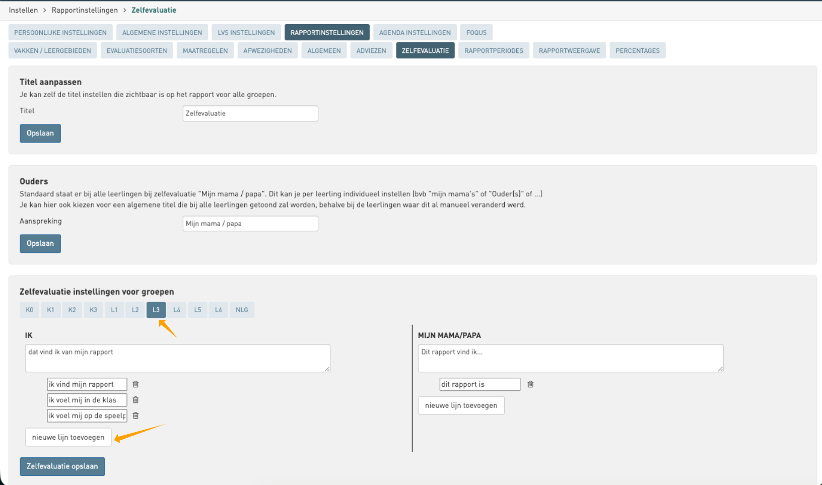 - Ga naar instellen - rapportinstellingen - zelfevaluatie.