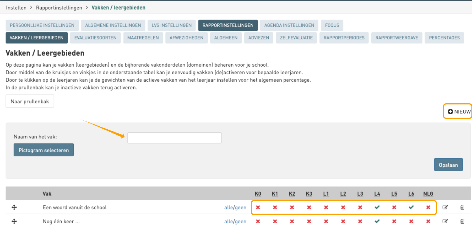 - Ga naar instellen - rapportinstellingen - vakken/leergebieden.
