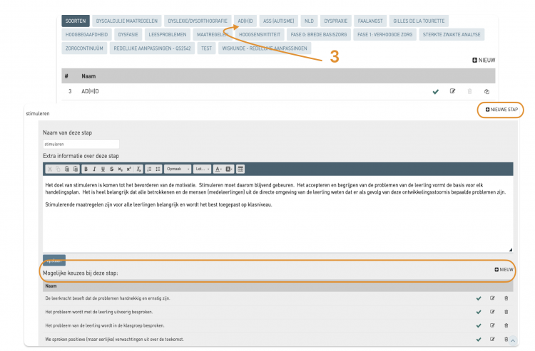 - Klik je op de knop van de het plan zelf, kan je met het potloodje en/of vinkje verdere informatie aanvullen, nieuwe stappen toevoegen en bij de stappen nieuwe mogelijke keuzes toevoegen.