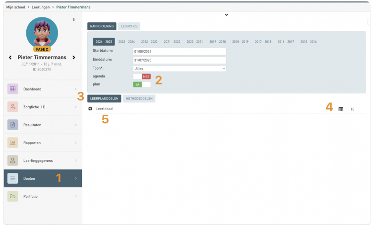 - De rapportering kan je raadplegen in de leerlingfiche van het kind onder de knop doelen.