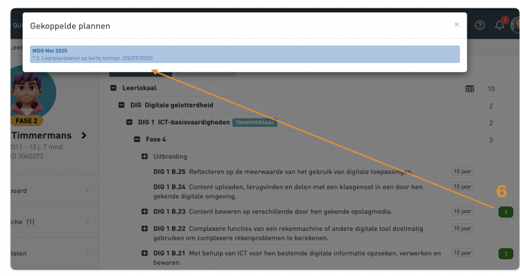 - Het groene cijfer achter het leerplan wijs op het aantal doelen dat reeds vanuit de plannen werd opgenomen.