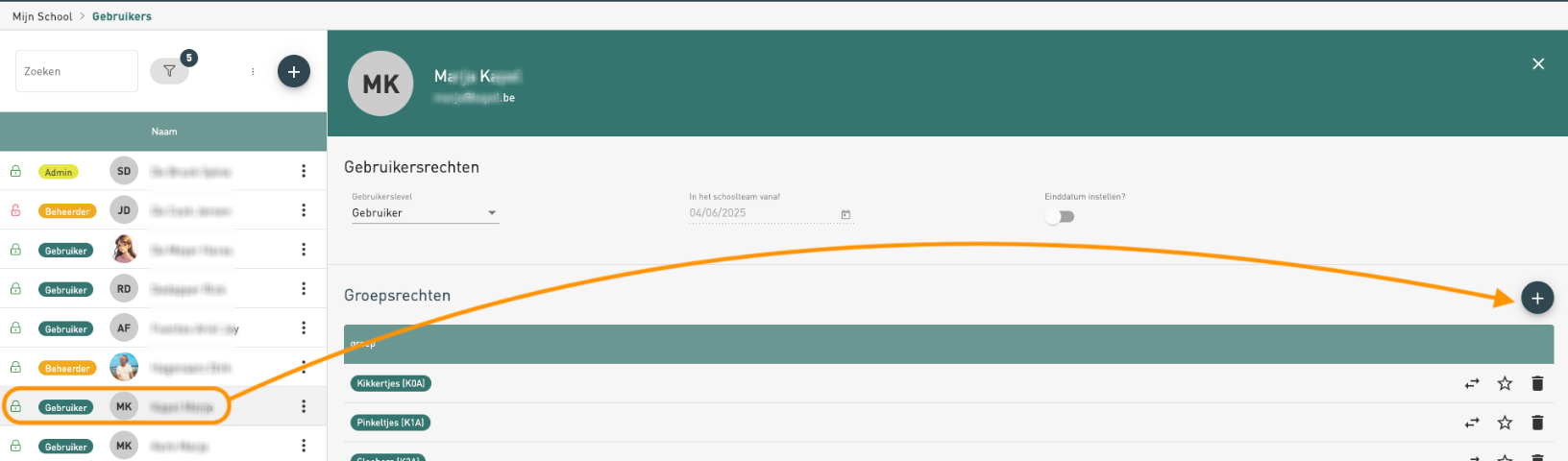 NOTE: Via de pijltjes kan je het recht omzetten van schrijven naar lezen of omgekeerd, via het sterretje maak je de persoon titularis van de klas en via het vuilbakje kan je het recht opnieuw verwijderen.