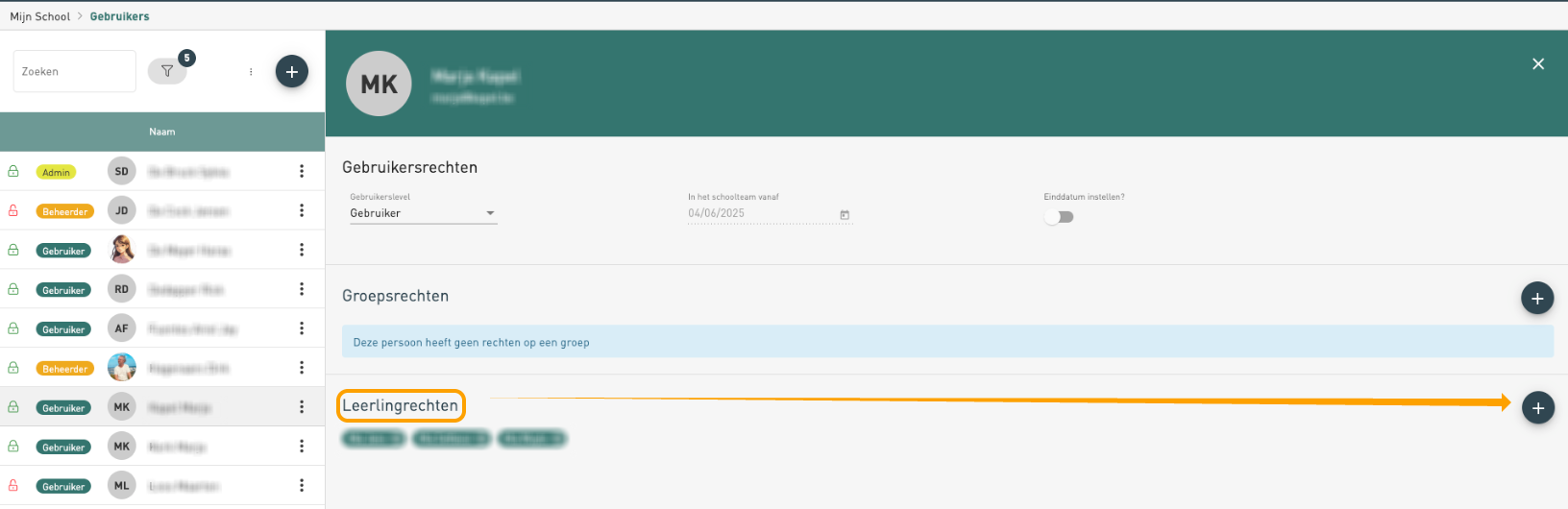 Voor 'leerlingrechten' klik je op het plusje bij 'leerlingrechten'.