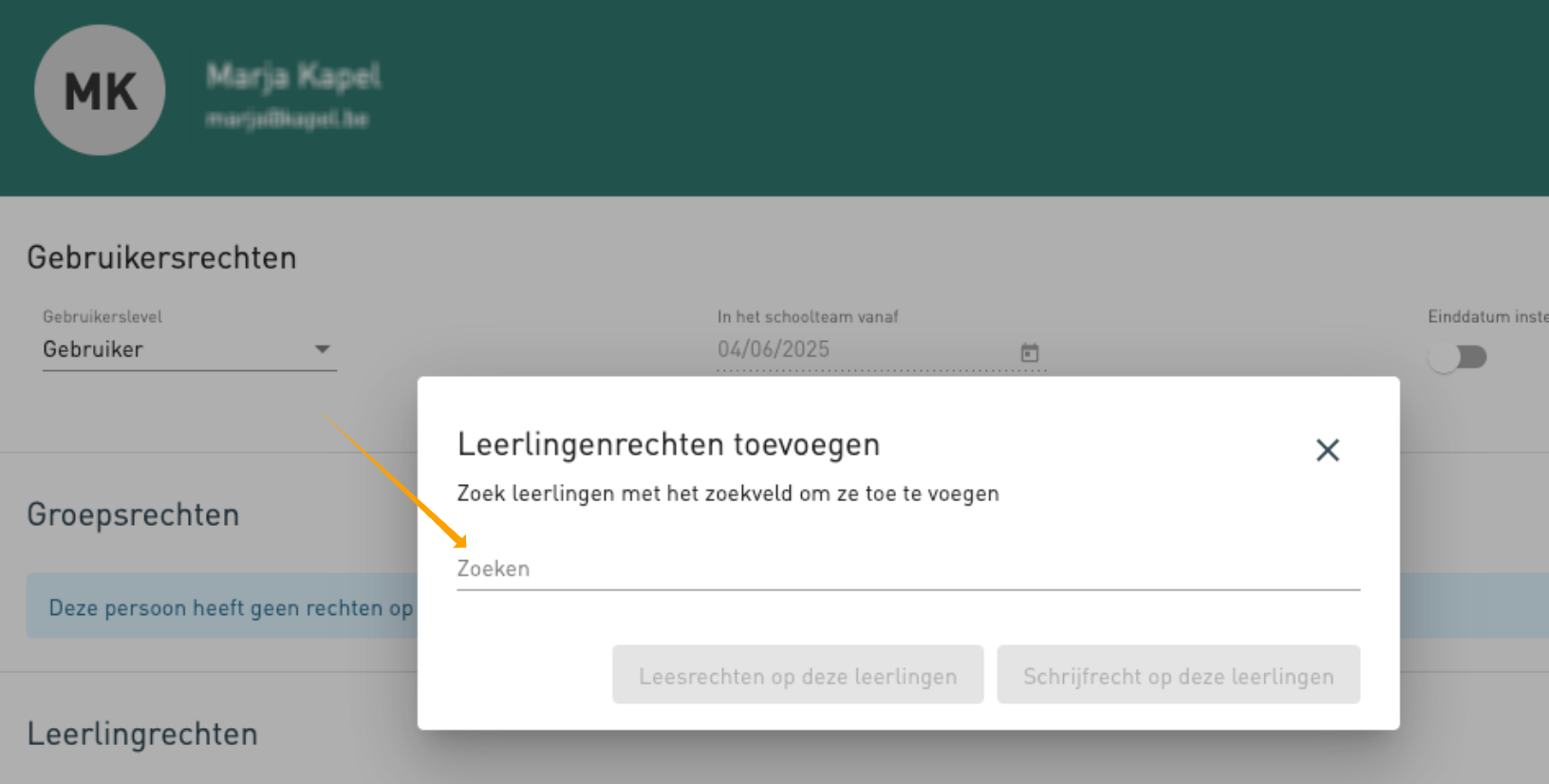 Zoek de juiste leerling en geef lees- of schrijfrechten.