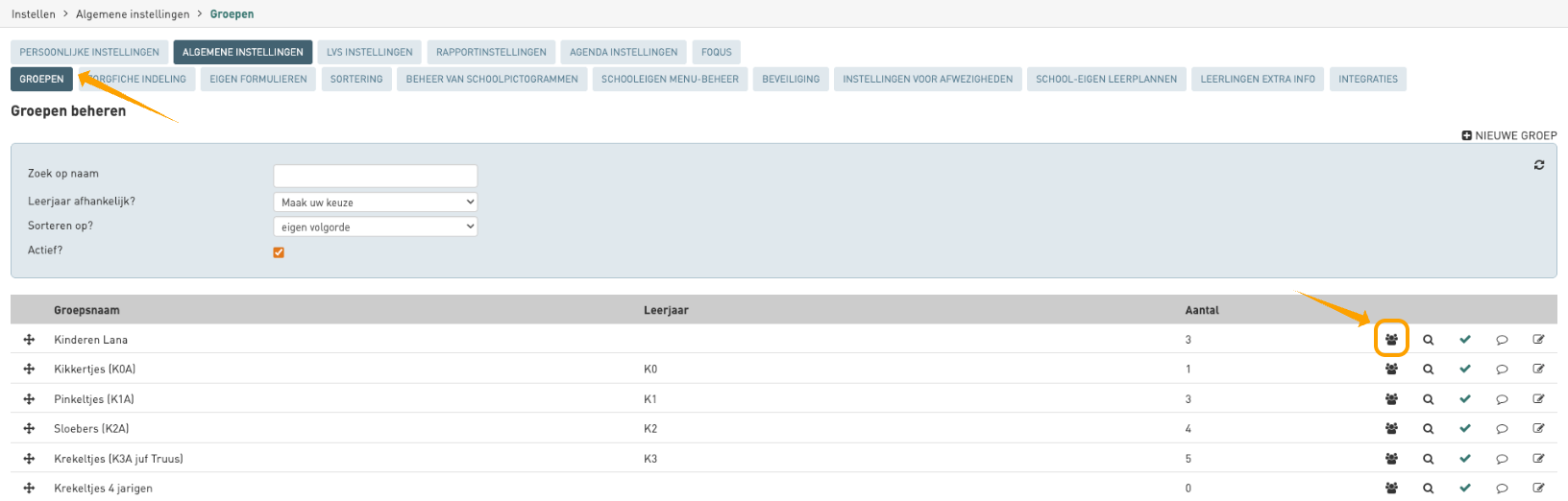 - Klik achteraan de gewenste klasgroep op het groeps-icoon (zwarte mannetjes).