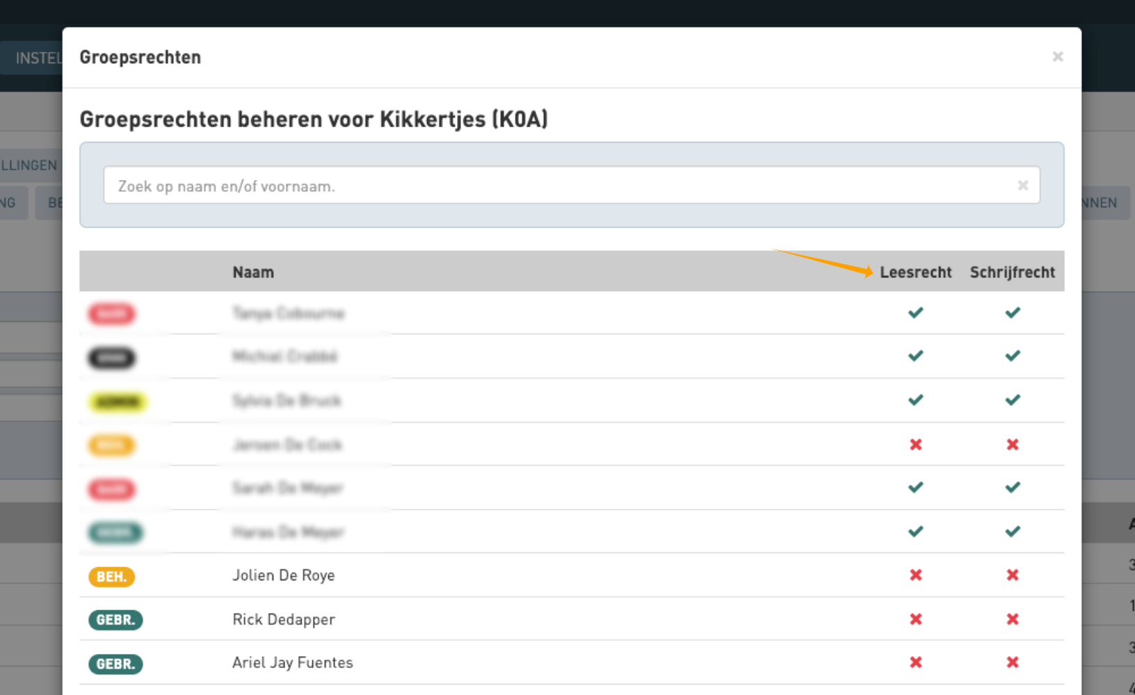 - Vink achteraan de naam van de juiste collega's het rode kruisje onder lees- en of schrijfrechten aan. Nadien heeft deze gebruiker meteen de juiste rechten.