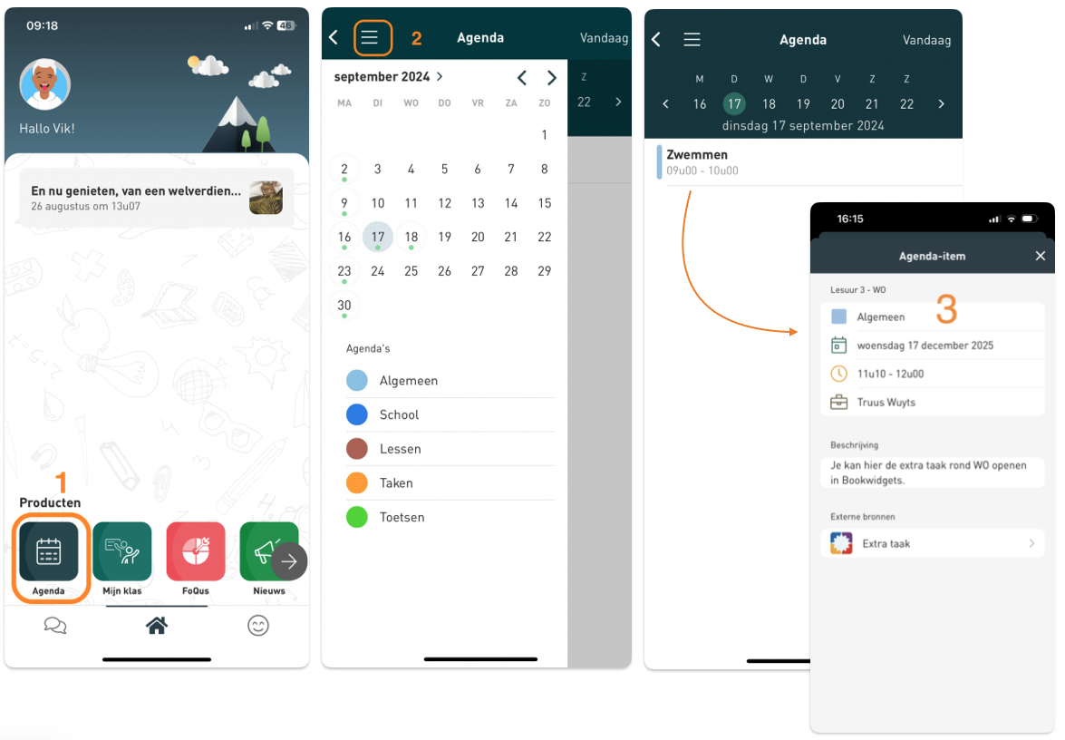 - Klik onderaan de horizontale menubalk op het luikje "Agenda". Je ziet dan onmiddellijk de activiteiten van vandaag.