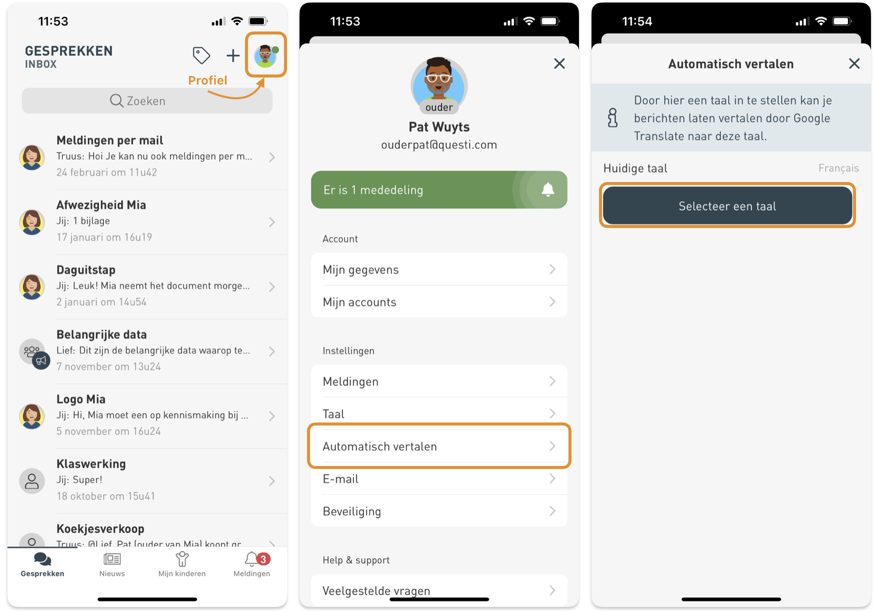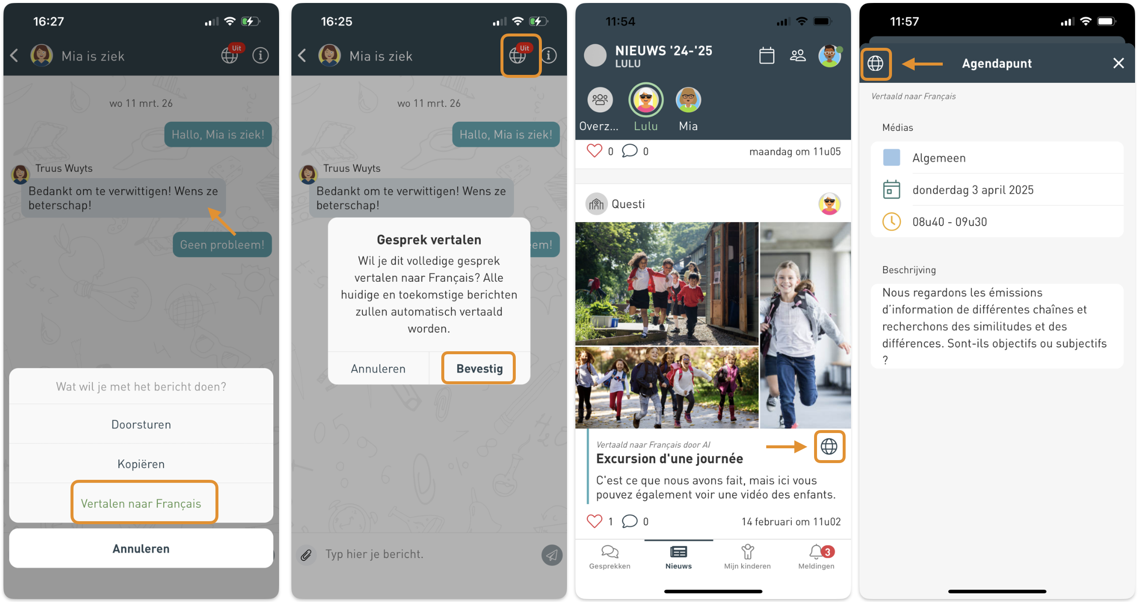 Via de automatische vertaling is het voor de ouder mogelijk om elk gesprek, nieuwsbericht en agenda item te vertalen naar een zelfgekozen taal.