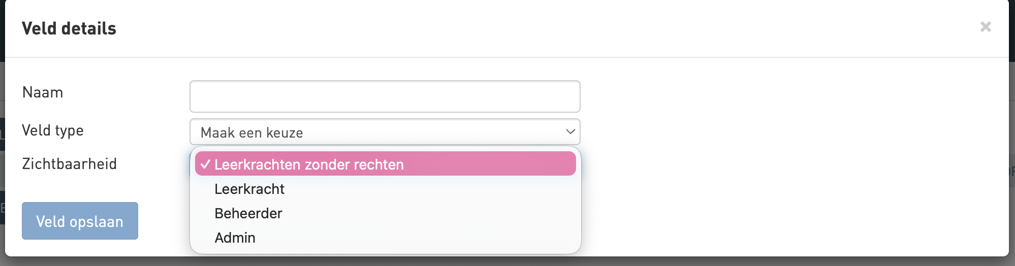 Wanneer je een nieuw extra info-veld aanmaakt of een bestaand veld bewerkt, kan je bij ‘zichtbaarheid’ instellen wie deze informatie kan zien.